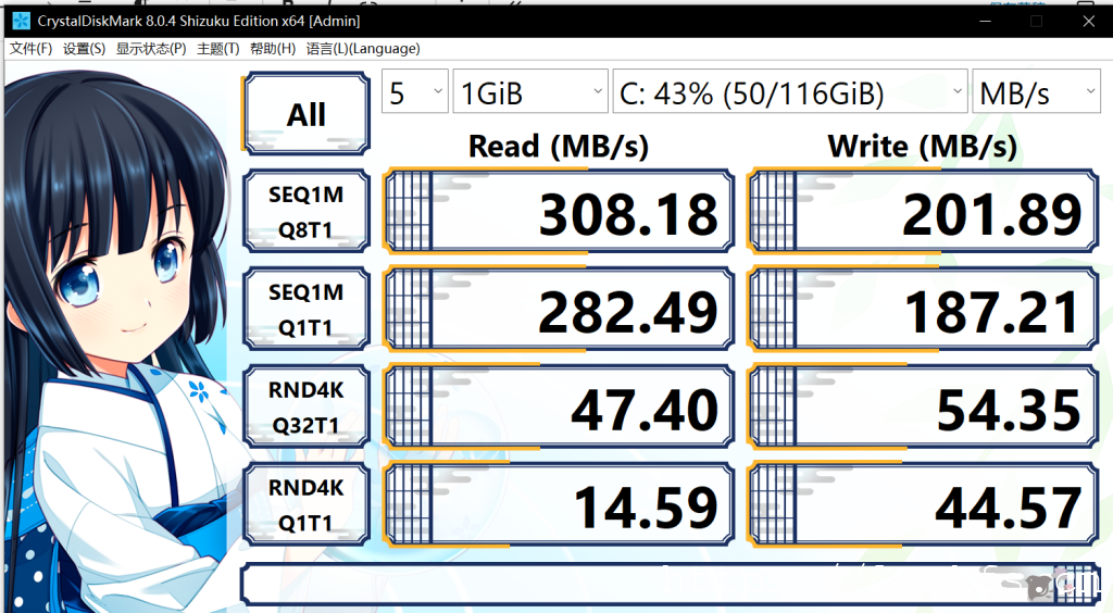 有点没想到的是这块“硬盘”,从设备管理器看到是块“SD”,我想大概是一块EMMC,实测速度倒是不低,顺序读取甚至能到300MB+,写入也有200MB左右,可以相当于是SATA3的SSD了,总之是很够了。